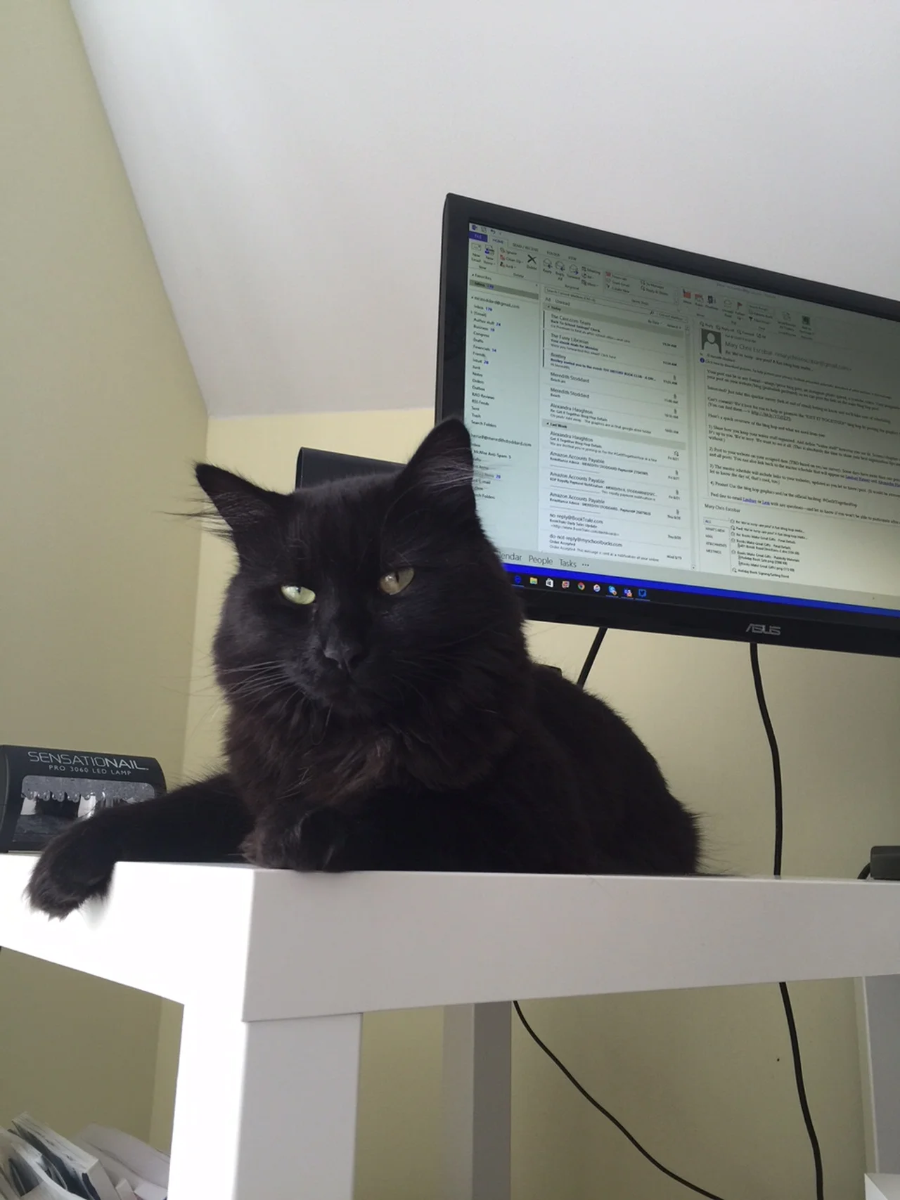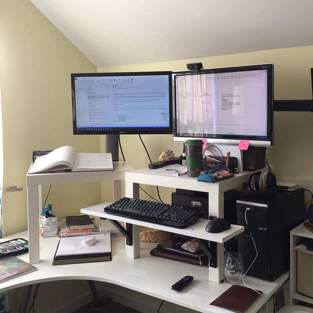 - Standing desk - I have converted to a standing desk using this plan and a few parts from Ikea. Why convert to a standing desk? Well, according to many people who already use them, they are productivity boosters that also have added health benefits. In my own experience, I have found that once my butt is seated in my nice, comfy office chair, I'm relaxed and more open to distractions. They live on Facebook and Pinterest. I find that when I'm standing, I'm checking things off my to do list at a much higher rate. I'm not tempted to pin a dozen patterns for knitted hedgehogs or binge watch four seasons of Call the Midwife. It's easier to stay focused. Also, it leaves more room on my desk for cats, and that makes them happy.